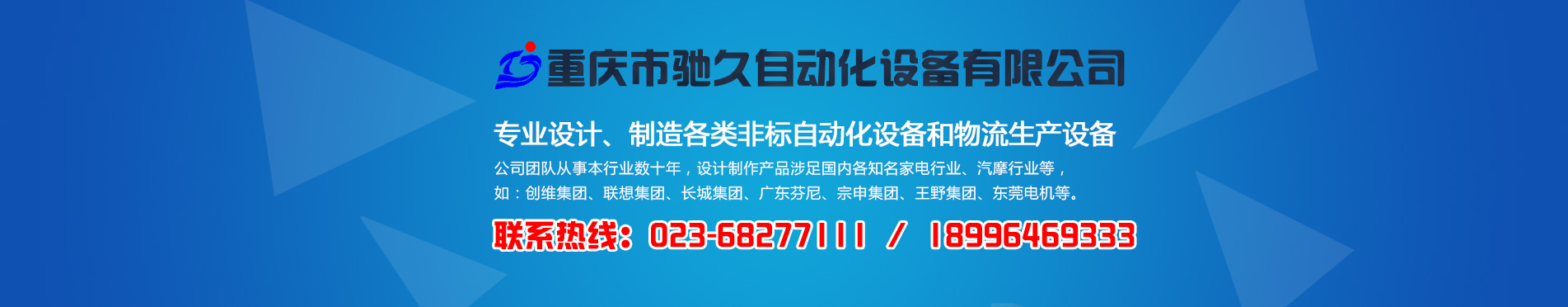 重慶市馳久自動(dòng)化設(shè)備有限公司是一家專業(yè)設(shè)計(jì)、制造各類非標(biāo)自動(dòng)化設(shè)備和物流生產(chǎn)設(shè)備的綜合性企業(yè)。 公司以“馳而不息,久而彌篤”為發(fā)展理念,堅(jiān)持“憑誠(chéng)信獲市場(chǎng),靠質(zhì)量得效益”的企業(yè)宗旨,不斷創(chuàng)新理念,持續(xù)發(fā)展技術(shù),為客戶提供滿意的自動(dòng)化物流系統(tǒng)解決方案和非標(biāo)自動(dòng)化設(shè)備。 公司生產(chǎn)基地坐落在重慶市北碚區(qū)歇馬鎮(zhèn)天馬村,占地面積約5000平方米。公司擁有先進(jìn)的加工設(shè)備,配套激光切割機(jī)、數(shù)控剪板機(jī)和折彎?rùn)C(jī)等;同時(shí)擁有自動(dòng)涂裝生產(chǎn)線。 公司團(tuán)隊(duì)從事本行業(yè)數(shù)十年,設(shè)計(jì)制作產(chǎn)品涉足國(guó)內(nèi)各知名家電行業(yè)、汽摩行業(yè)等,如:創(chuàng)維集團(tuán)、聯(lián)想集團(tuán)、長(zhǎng)城集團(tuán)、廣東芬尼、宗申集團(tuán)、王野集團(tuán)、東莞電機(jī)等。 [ 了解更多 ]